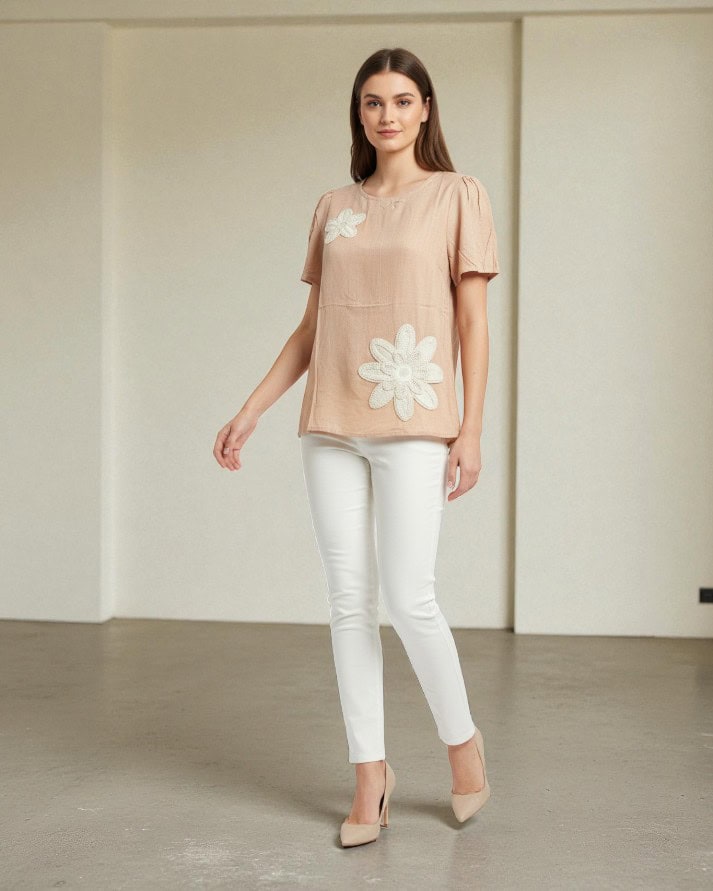 Blusa de modelagem solta e caimento leve, confeccionada em tecido fluido que proporciona conforto e elegância. Possui decote redondo e mangas curtas, com aplicação de bordados frontais que adicionam um toque artesanal e sofisticado à peça. Versátil e moderna, é ideal para composições que vão do casual chic ao elegante, dependendo da combinação de acessórios.