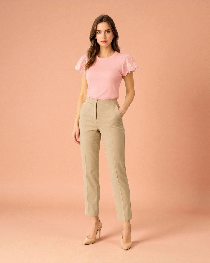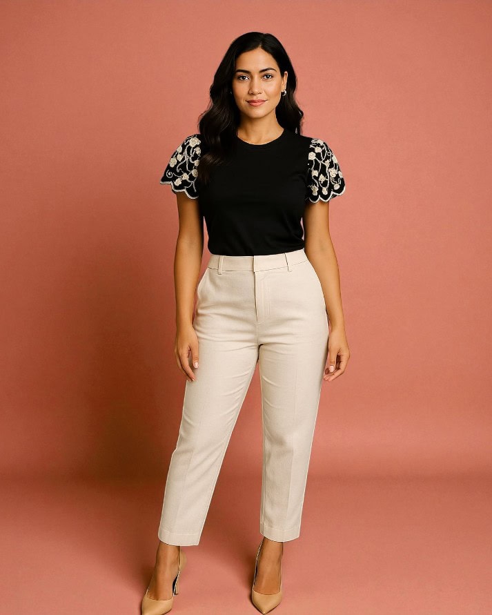 Esta blusa é a peça perfeita para elevar o seu visual, combinando o conforto de uma base básica com detalhes sofisticados. Possui um decote redondo discreto e modelagem de caimento suave ao corpo. O grande diferencial está nas mangas curtas (estilo borboleta ou levemente bufantes), confeccionadas em renda, tule ou tecido vazado e enriquecidas com bordados florais delicados. Ideal para adicionar um toque romântico e elegante a looks casuais ou de trabalho.