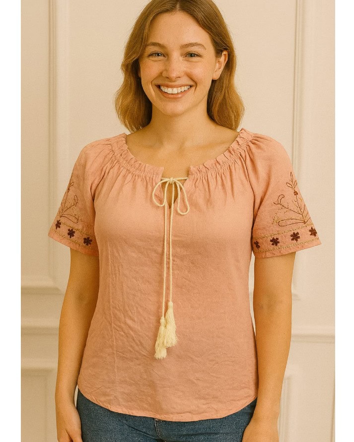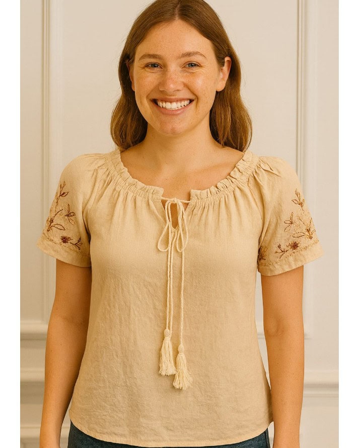 Adicione um toque romântico e boho chic ao seu guarda-roupa com esta linda blusa de caimento leve e confortável. O decote ciganinha (ombro a ombro) com elástico franzido traz um charme especial e valoriza o colo, enquanto a amarração frontal com cordão e tassel (franjas) adiciona um detalhe artesanal encantador. As mangas curtas levemente bufantes apresentam delicados bordados florais e estrelas em tons terrosos, enriquecendo o visual. Ideal para combinar com jeans ou saias longas, esta blusa é perfeita para quem busca conforto, estilo e feminilidade em uma peça só. Garanta a sua e arrase!