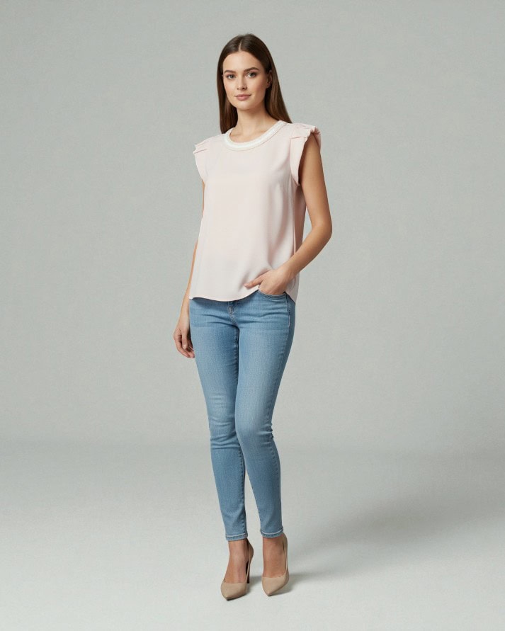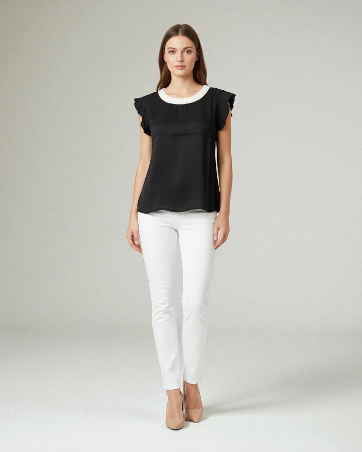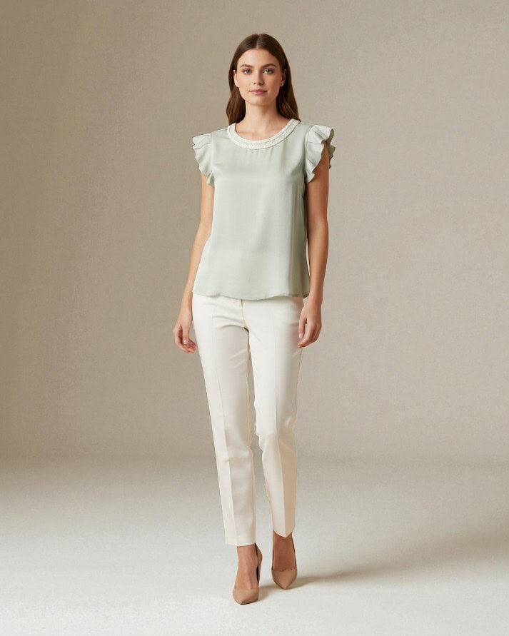 Blusa com modelagem solta e caimento leve, confeccionada em tecido fluido que garante conforto e elegância. Possui decote redondo com detalhe aplicado que valoriza o visual e mangas curtas com delicados babados, trazendo um toque feminino e moderno. Versátil e atemporal, é uma peça ideal para compor produções sofisticadas ou casuais, perfeita para diversas ocasiões.