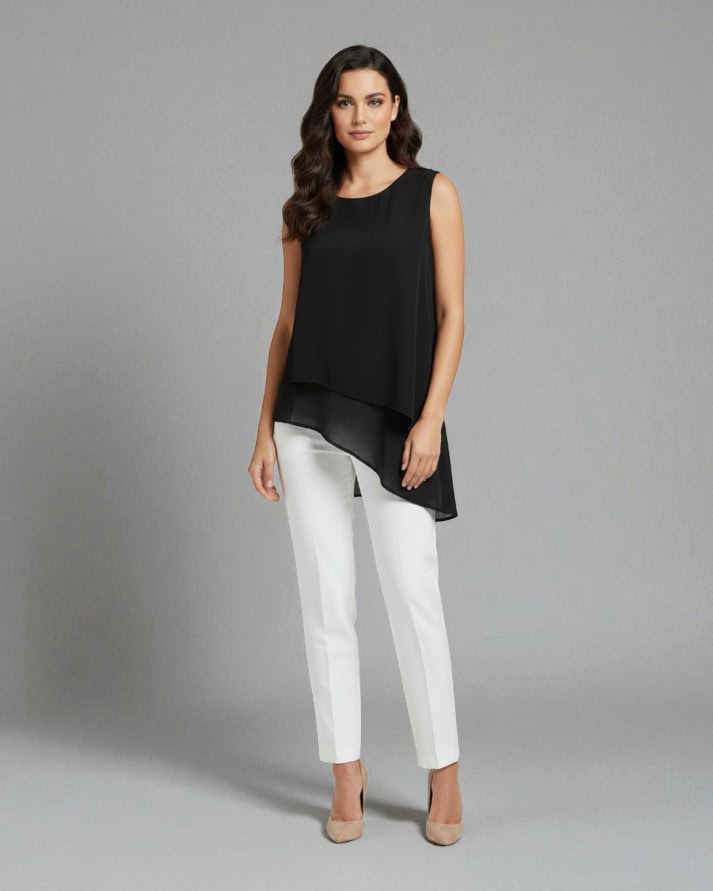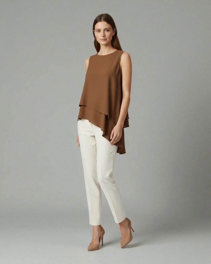 Blusa sem mangas com modelagem solta e caimento fluido, confeccionada em tecido leve e elegante. Apresenta design assimétrico com camadas sobrepostas que criam movimento e um visual moderno e sofisticado. Possui decote redondo e acabamento delicado, sendo uma opção versátil para composições elegantes, do casual chic ao look de trabalho.