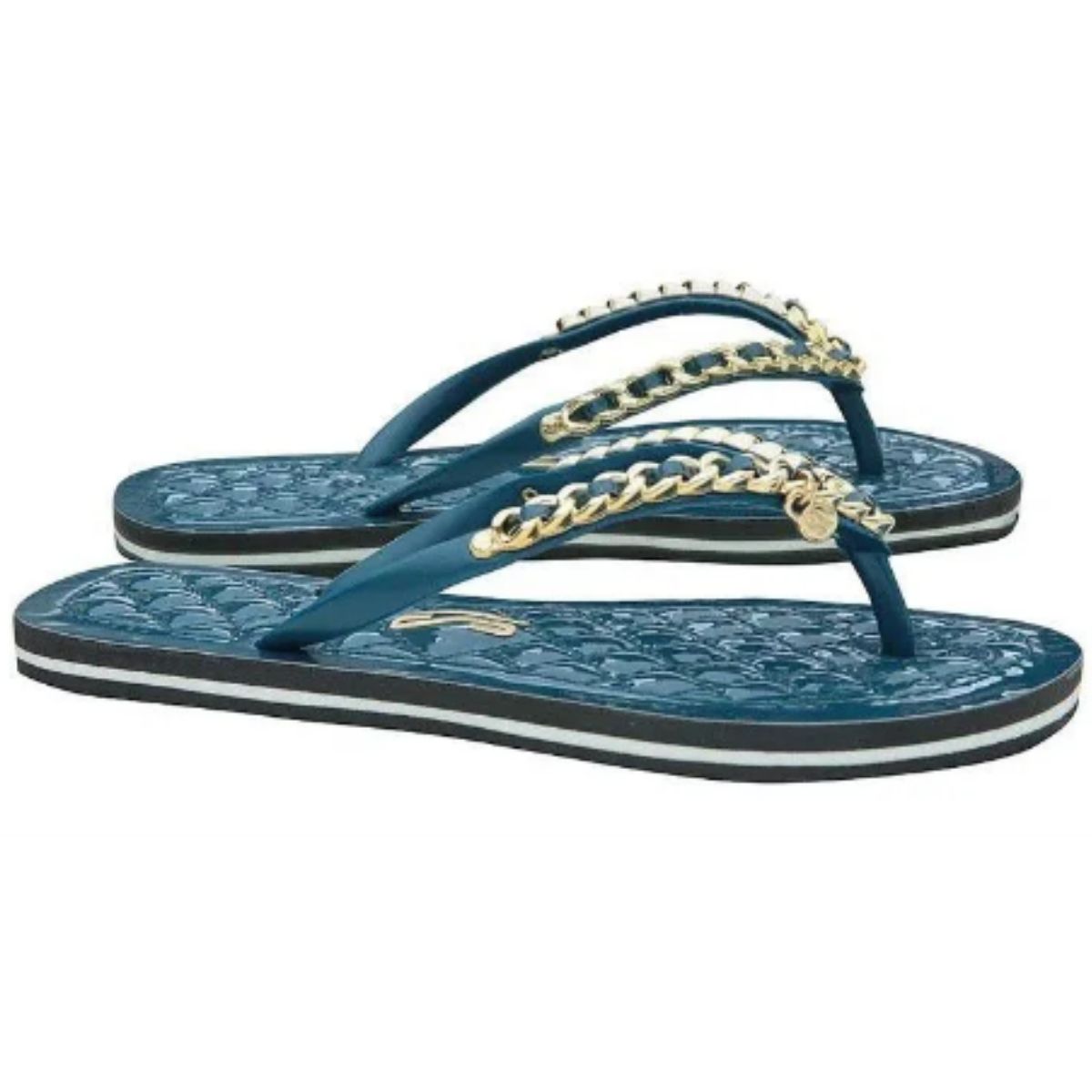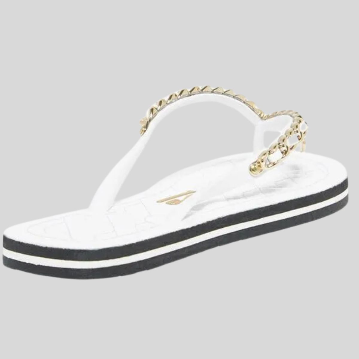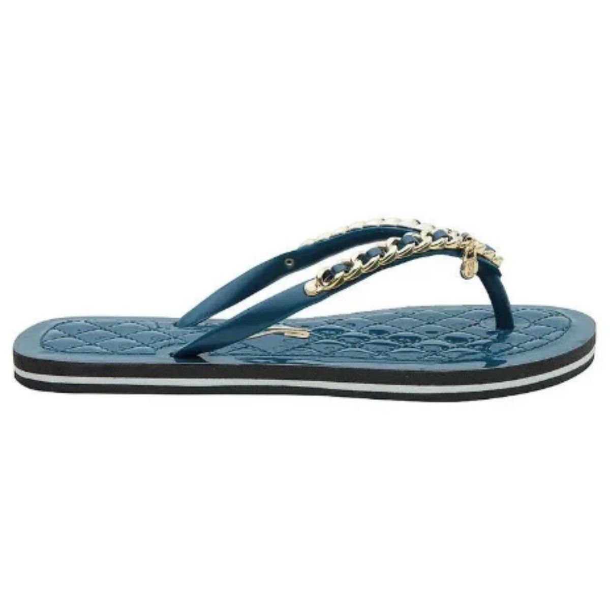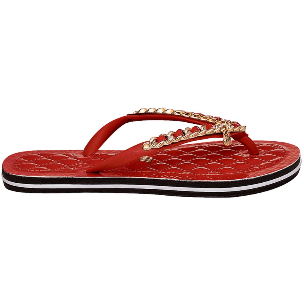 O chinelo flip flop corrente preto possui solado emborrachado, correia grossa com detalhes em correntes é confortável e design da sola envernizada em matelassê. ideal para quem quer fazer um passeio casual, abusando de looks com shorts e camisetas é elegante e valoriza os pés.