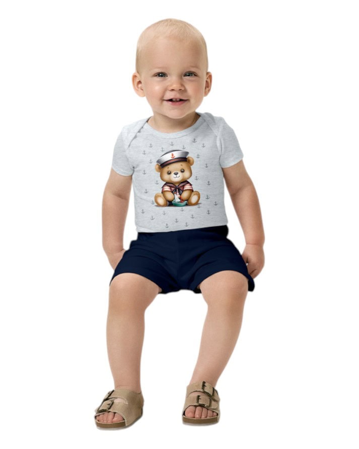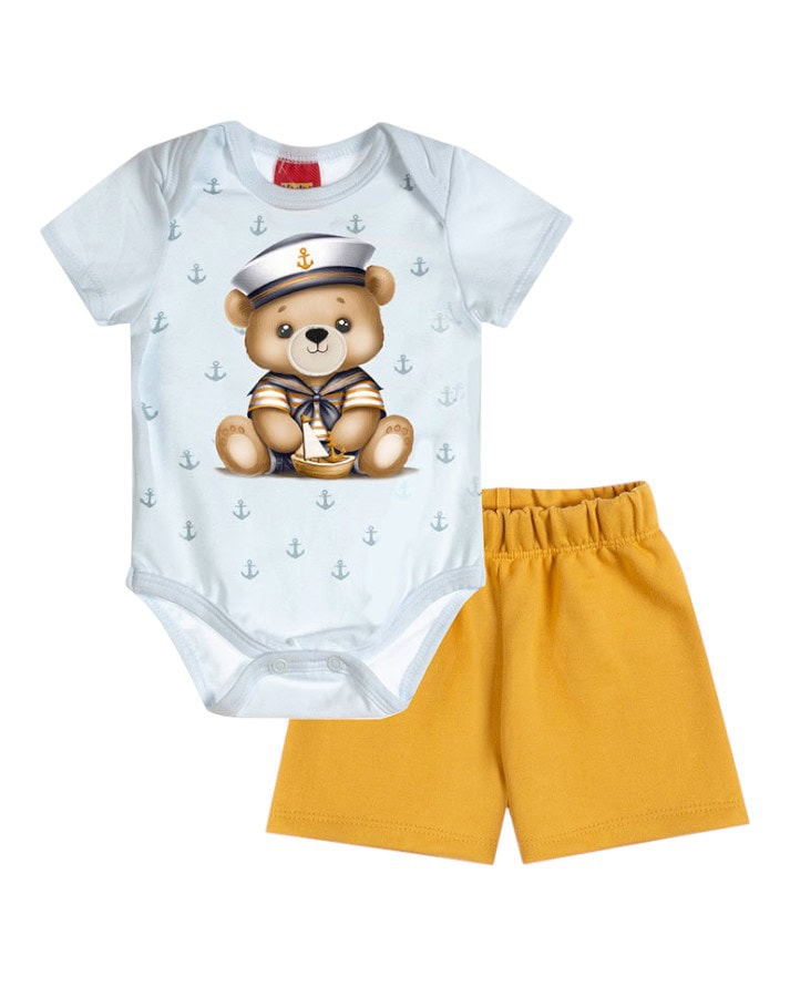 Conjunto Kyly Infantil Masculino composto por body estampado e short confortável. Um conjunto ideal para todas as ocasiões, garantindo conforto e maciez para o seu bebê.