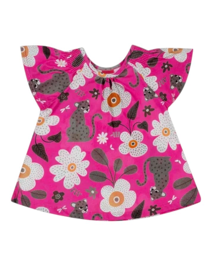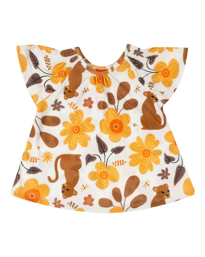 Conta com estampa divertida que mistura elementos da natureza com animais, tornando a peça lúdica e alegre.