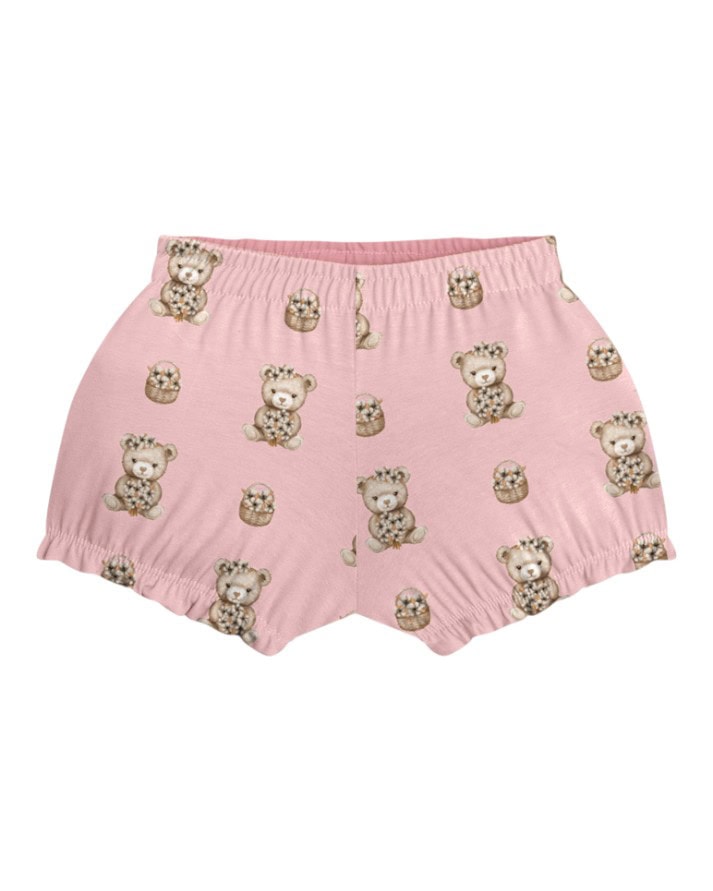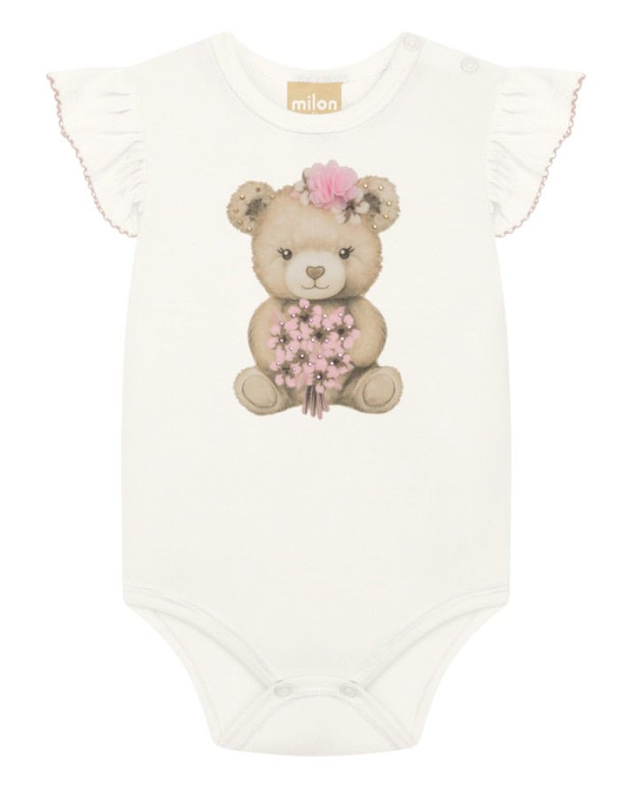 Encante-se com a delicadeza deste conjunto da Milon, perfeito para os dias quentes! Composto por um body bege com estampa exclusiva de ursinha e aplicação de flor, e um short verde com estampa rotativa de ursinhas e cestas floridas, é uma escolha charmosa e confortável para a sua bebê.