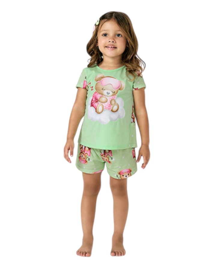 Conjunto pijama infantil confeccionado em malha 100% algodão, composto por blusa e short estampados. Tecido confortável ideal para noites confortáveis