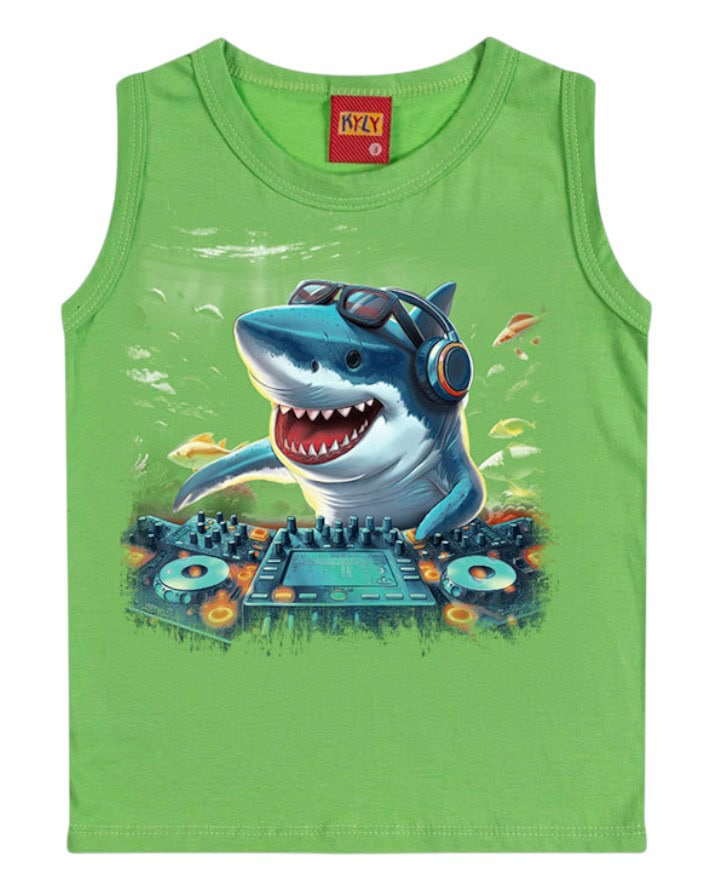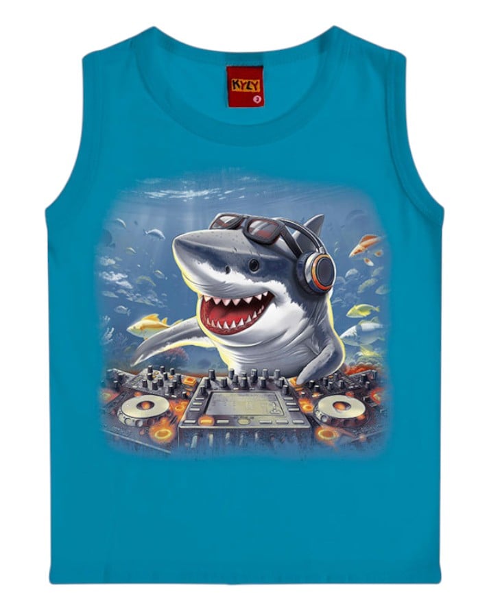 Confeccionada em malha de algodão, a regata proporciona conforto e leveza para os dias mais quentes. Possui estampa divertida de tubarão DJ, trazendo um visual moderno e cheio de personalidade para os pequenos. Ideal para compor looks casuais e descontraídos, garantindo liberdade de movimentos e estilo em qualquer ocasião.