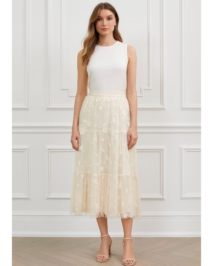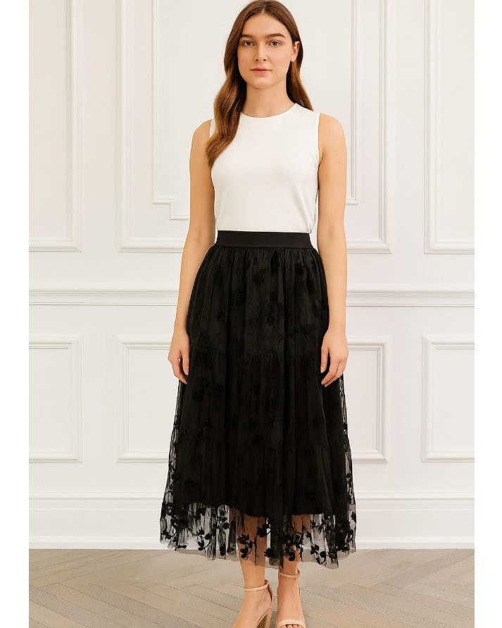 Encante-se com esta saia midi romântica e extremamente elegante! Ideal para festas, eventos especiais, casamentos ou um look sofisticado de dia. Confeccionada em tule macio, ela se destaca pelo delicado bordado floral em relevo por toda a peça, criando um efeito de renda deslumbrante. O design em camadas (três marias) garante movimento e um caimento fluido, enquanto a cintura alta com cós liso (aparentemente em cetim ou tecido acetinado) define a silhueta. Possui forro para total conforto e discrição. Peça-chave para um visual feminino e inesquecível!