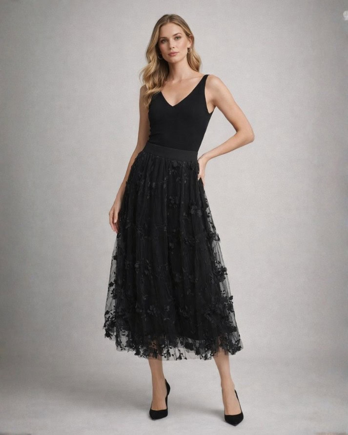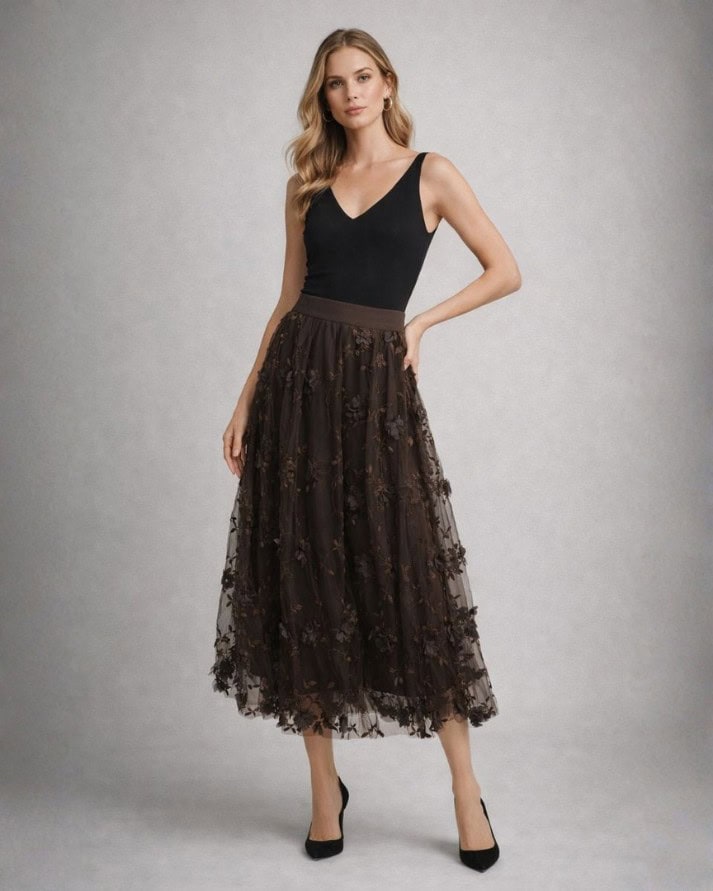 Esta Saia Midi é uma peça romântica e cheia de personalidade, perfeita para eventos sociais ou composições que buscam leveza e sofisticação. Confeccionada em tule delicado, a peça é inteiramente adornada com aplicações florais em relevo (3D) e bordados de ramos, que criam uma textura rica e um visual etéreo.