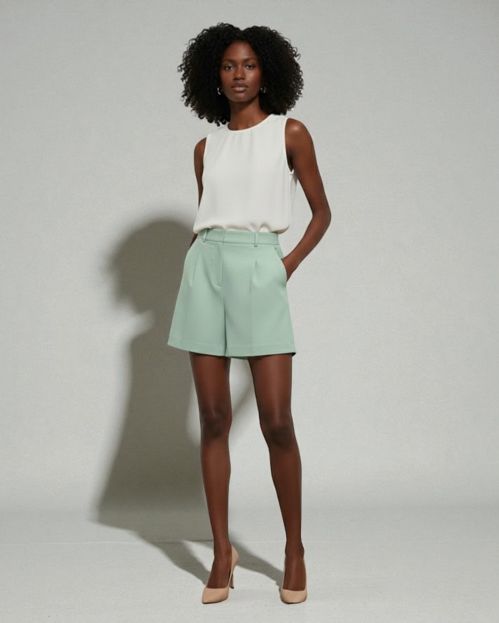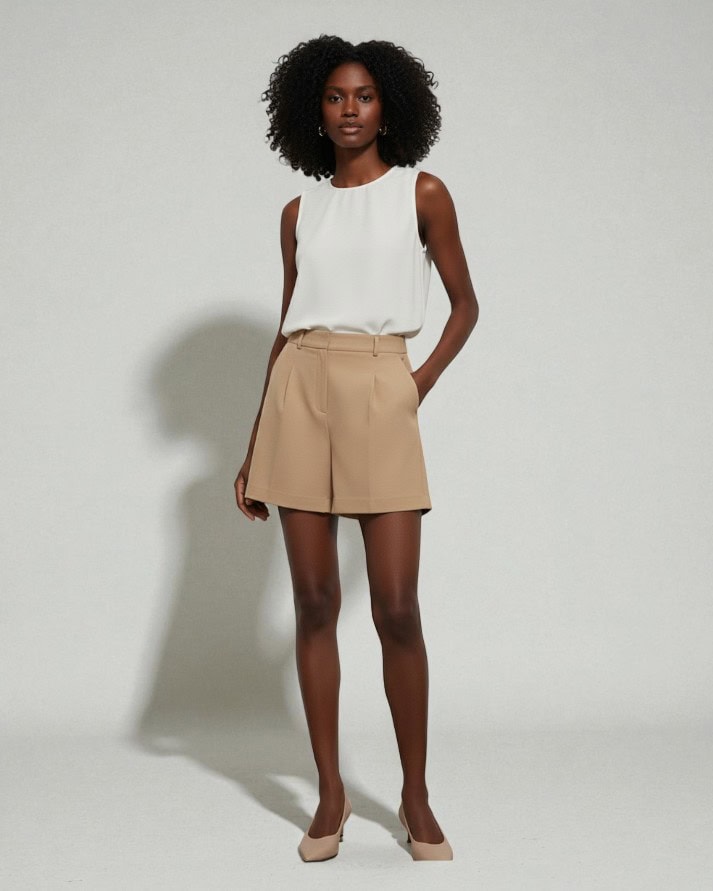 Short alfaiataria com modelagem reta e caimento estruturado, confeccionado em tecido leve com toque sofisticado. Possui cintura alta, pregas frontais que valorizam a silhueta, bolsos laterais funcionais e fechamento por zíper e gancho. Versátil e elegante, é uma peça ideal para composições modernas e refinadas, perfeita para o dia a dia ou ocasiões especiais.