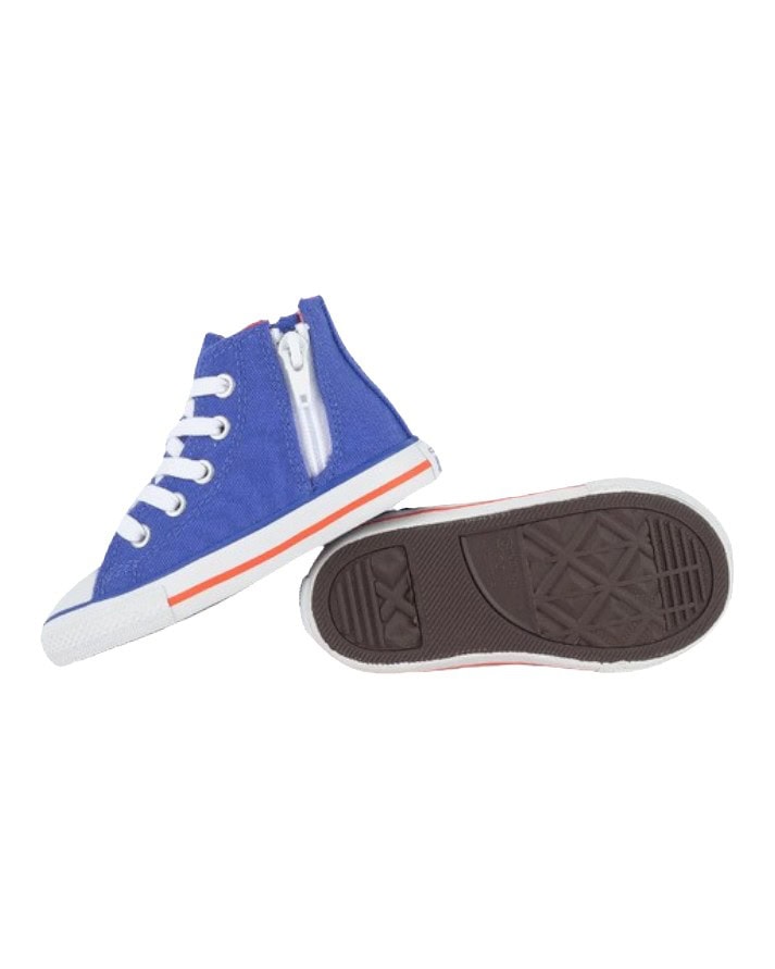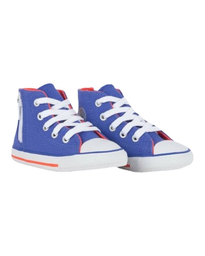 O clássico Chuck Taylor All Starna versãokidse emcores sazonais, é confeccionado em tecido canvas de algodão tipo lona, possui costuras duplas, ilhoses na cor prateada, uma tira de tecido no calcanhar que proporciona maior suporte ao tênis, zíper na parte externa do cano do tênis para facilitar o calçar, forro interno acolchoado para maior conforto e dois ilhoses laterais para uma transpiração adequada aos pés. OPatch Logocom assinaturaConverse Chuck Taylor All Staré aplicado na parte interna dos canos, enquanto o logo Converse All Star é aplicado naheeltabdo calcanhar. O solado vulcanizado garante a aderência adequada ao caminhar.