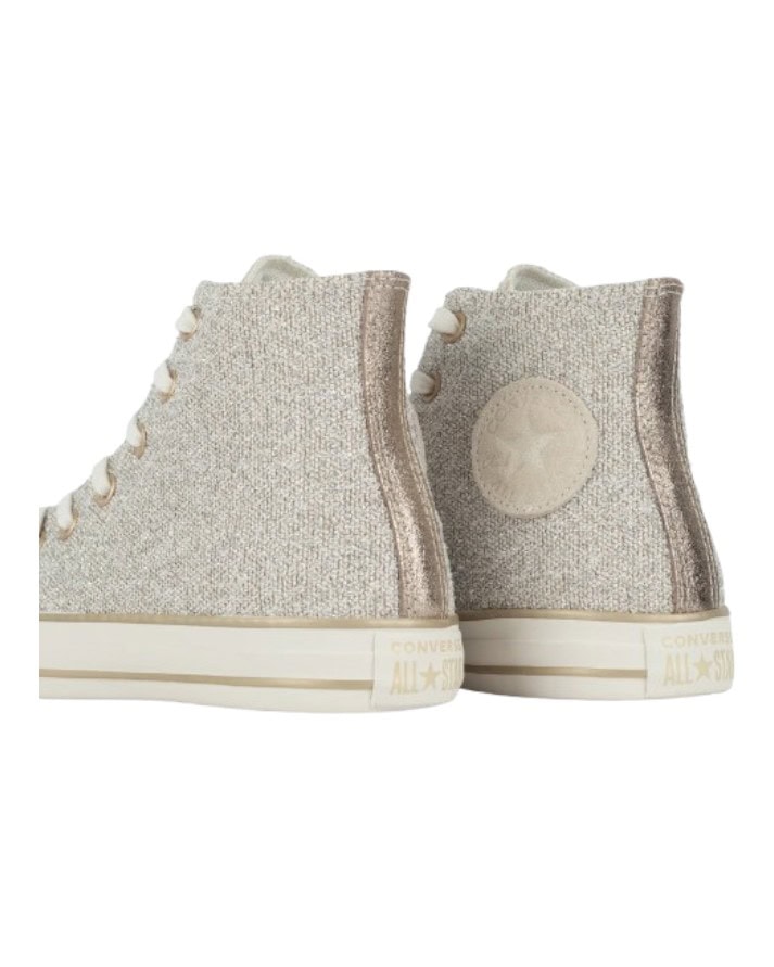 Detalhes: Roube a cena com a nova coleção Pretty Patina. Inspirado no efeito Patina, uma obra de arte natural causada pela exposição de uma superfície metálica ao clima e ao tempo. Confeccionado em tecido jacquard com fios metalizados, possui costuras duplas no cabedal para maior resistência, forro interno acolchoado para maior conforto, uma tira metalizada na região do contraforte, enquanto os dois ilhoses laterais permitem uma transpiração adequada aos pés. Na parte interna dos canos o Patch Logo com o logo Converse All Star é aplicado, já a tradicional tag traseira aparece aplicada no calcanhar. O solado de borracha vulcanizada garante mais aderência a cada passo.