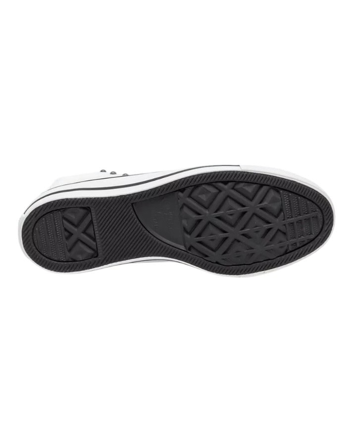 Tênis da linha Chuck Taylor All Star, a mais tradicional da marca Converse. Modelo feminino de cano alto, confeccionado em tecido lona na cor branca. Esta coleção conta com detalhes de rebites metálicos, desenhado para ser fácil de combinar com qualquer look com adição de detalhes glam. O icônico logo da marca aparece em suas laterais internas. Ele conta com fechamento em cadarço e solado e vira de borracha.