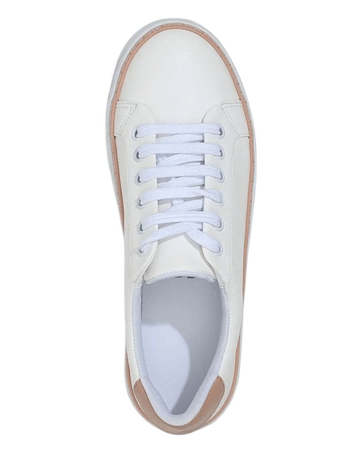 Tênis flatform branco, possui solado branco, bico redondo, fechamento em cadarço e detalhe de tira pequena com nome da marca em volta. Lindo e estiloso, perfeito para compor looks mais casuais