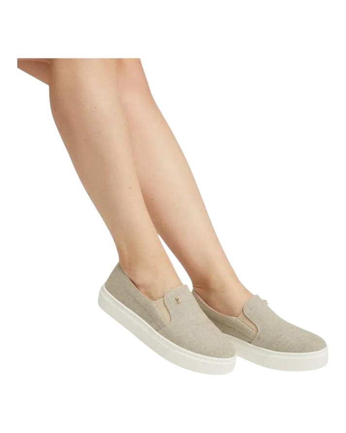 Tênis slip on tecido natural linho bege possui bico arredondado o fechamento é com elástico na lateral. é ousado, é fashion, para pessoas com atitude.