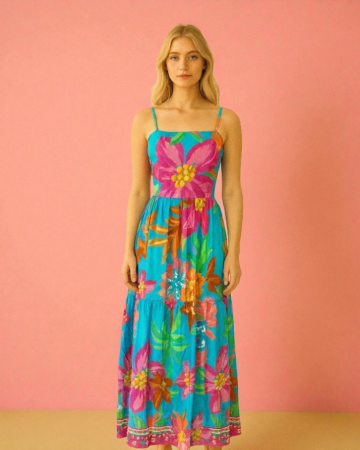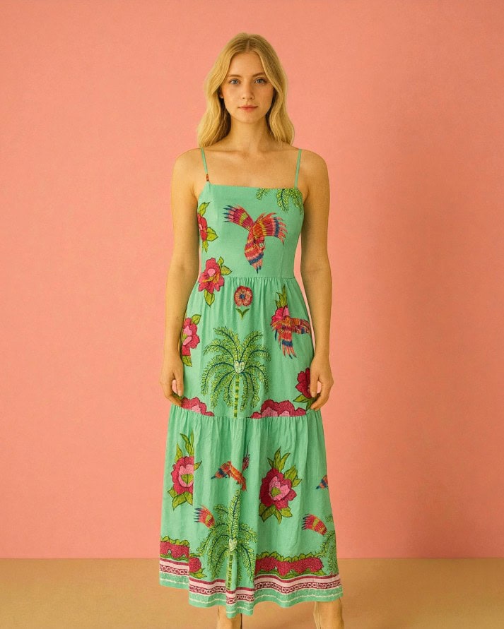 Este vestido longo é uma peça de impacto, ideal para eventos de verão e ocasiões especiais. Possui decote quadrado e alças finas reguláveis. A cintura é marcada por uma faixa com bordado geométrico/étnico. A saia, em modelagem de duas ou três camadas com franzidos, garante um caimento fluido e elegante. O grande destaque é a estampa rica e colorida, que combina elementos tropicais como coqueiros, pássaros estilizados e flores vibrantes, com detalhes que remetem a bordados. A barra é finalizada com uma faixa decorativa contrastante.