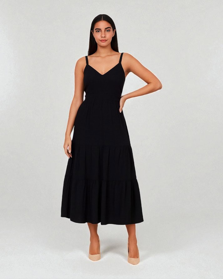 Vestido midi em tecido leve, com alcinhas finas e decote em V que valoriza o colo. Possui cintura marcada que alonga a silhueta e saia fluida com recortes em camadas, trazendo movimento e delicadeza ao visual. Na cor rosa claro, é uma peça feminina, versátil e elegante, perfeita tanto para ocasiões casuais quanto para eventos mais sofisticados. Combina muito bem com sandálias ou salto neutro.